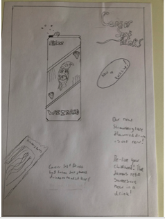 As we can see on the draft for the magazine advert, I have drawn an image of the drink around the middle of the page which stands out from everything else on the page because it is the part that the viewer sees first. I have then also included information about how it is based on a retro concept that should appeal to the older target audience, whilst informing anyone looking at the advert that this is a new type of drink that hasn’t been thought of before by saying that the company has taken fruit flavoured drinks “to the next level”. The company logo that I have created is in the top right corner, and in the bottom right there is an image of strawberry laces to show that this is the ingredient in which the drink is flavoured with. We want to produce this advert around the same time as the billboard in order for the campaign to be consistent across different platforms at once. For example, if somebody reads a magazine and see’s this, they could easily forget about it. But say they later on drive past a billboard that advertises the same product then it will begin to stick in their mind much more easily.